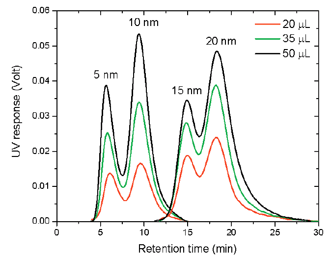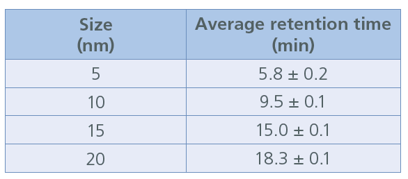 The average retention times for each AuNP size are presented in Table 1, with standard deviations. The retention time reproducibility with varying injection volume is very good, with % relative standard deviations all below 4.5 %.