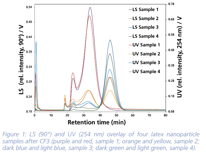 Figure 1 shows the overlay of the LS, resp. UV trace of each sample. Since the same fractionation method was used, the retention time (peak maxima) can be used to identify comparable samples (referred also to relative calibration). The LS and UV response of the particles decrease in the order: