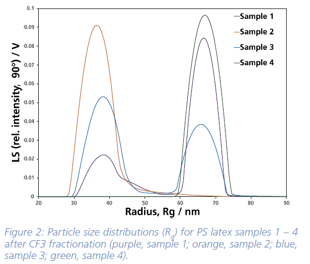 Centrifugal Field-Flow Fractionation (CF3) coupled to suitable detectors, like Multi-Angle Light Scattering (MALS) and Dynamic Light Scattering (DLS), in combination with concentration detectors (UV, RI), is a straightforward setup to continuously monitor particle and polymer production on a robust and highly reproducible level. [1]