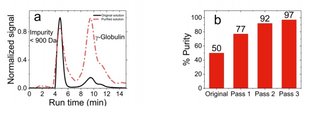 Experimental results are provided that demonstrate how the diffusion-based purification system is able to provide a fast, high throughput alternative to traditional protein purification methods. A single cartridge continuous SPLITT fractionation system is shown to be capable of processing 1.4-litres of protein solution (43g of protein) per day.