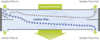 The system is using a gravity field and thus can separate microparticles from about 1 to 100 µm in typical aqueous based carrier solutions. A resolution of 1 µm size difference can be achieved for smaller particles.
